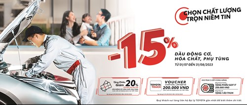 Với mong muốn tri ân khách hàng đã luôn tin yêu và đồng hành cùng Toyota trong suốt thời gian qua, Toyota Việt Nam và hệ thống đại lý Toyota trên toàn quốc thực hiện chương trình khuyến mãi dịch vụ “Tri ân Khách hàng – Muôn vàn ưu đãi” dành cho tất cả các khách hàng làm dịch vụ tại hệ thống đại lý ủy quyền của Toyota Việt Nam từ ngày 01/07 – 31/08/2023.
