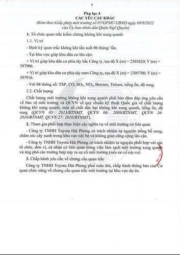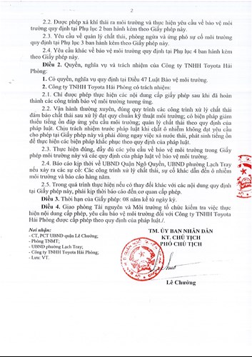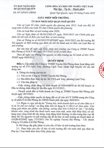 Công ty TNHH TOYOTA Hải Phòng được UBND Quận Ngô Quyền cấp giấy phép Môi Trường